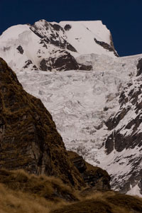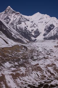 Milam Glacier & Nanda Devi East Base Camp This is a nice trek that offers very good views of Nanda Devi. A permit is needed from the SDM office in Munsiary but it is easy to obtain, even for foreigners, and free of charge just requiring a bit of leg work to make copies and drop off a copy of the permit at he ITBP post across town. There are no passes and the elevations are relatively low by Himalayan standards only a little over 4000 m. This trek is probably best done before the monsoon in May-June but I did it in early mid October finishing October 14th. Weather wise it was a great time to trek but it was just about as late as you could do it still relying on the small hotels for food and shelter. When I was going up all of the hotels along the trek were open but when I was going down a number of them had closed. The first part of the trek passes through a gorge with the high mountain views only opening up after Rikot. Of the villages of the upper valley Martoli probably has the best location. Its slightly off the main path take the path up to the left after Rikot and near where the abandon village of Tola sits on the opposite side of the valley. From Martoli you can hike up the slopes above the temple (30-45 minutes) to get a view of both Nanda Devi peaks, Trisul, and Hardeel (four +7000 m peaks). A route to the traditional Nanda Devi East base camp starts from Martoli but you will need at least 2 days of food to do this. Apparently there are some stone shelters you could use if not carrying a tent I did not personally make it up that direction. I went up to the base of Nanda Devi via the Pachu valley. From Pachu I made it up to the base camp in 3 hours but this is relatively fast still it can be done as a day hike. There is a nice camp site one and a half to two hours up the southern side of the valley and a rock shelter a bit further up from the camp site. There are trails on both sides of the valley but the one on southern side is better maintained and has better views of Nanda Devi. Milam is on the opposite side of the river as Pachu unfortunately as of October 2009 the northern most bridge across the Gori Ganga is at Burphu about 1.5 to 2 hours back down the valley from Pachu. If you don't mind the cold and if the river is not too high apparently there is a place just below Milam where it is possible to ford. The ITBP camp at Milam can be a bit annoyingly over zealous but friendly. If they try to compound your camera for your stay in Milam just argue a lot and offer to show you digital pictures when you leave to assure them you didn't take any pictures of the camp (they didn't even bother to check mine when I left), if you have a film camera don't tell them you have a camera. The view from Milam Glacier "zero point" itself is not that great lots of grey rock grey ice and grey water. The approach is better, but for the best view hike up the east side of the valley for about an hour and a half to two hours past "zero point" where you will get a panoramic view of the peaks and see the glacier descending from the slopes of Trisul. The trail is quite good after initially being rather rough. The trail starts where the stream comes down to the glacier from the east near zero point. Cross to the northern side of the stream and climb the steep slope the trail eventually levels off and traverses along the eastern side of the valley high above the glacier.