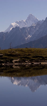 Trekking Routes If you have your own camping gear the number of possible routes throughout Garhwal and Kumaun are almost endless. I'll just mention the two short treks I did. Roop Kund This is a nice short trek that can be done independently in the "local style" (there are numerous roofless rock shelters along the way) or full camping. The trek finishes at the mysterious lake of Roop Kund which contains a large number of human bones. However it is worth hiking up to Jyuri Guli, the pass above the lake for incredible views of the towering 7120 m (23,350 ft) face of Trisul, on the western edge of the Nada Devi Sanctuary. The trail heads up to the right (south) side of the lake.