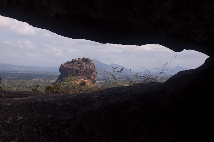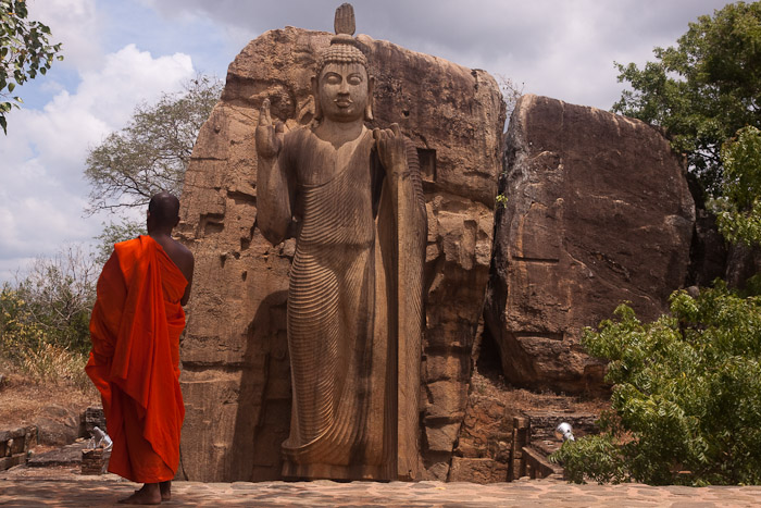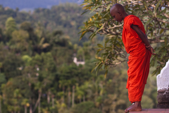 Boy monk peers over the edge at the Lankatilake Temple near Kandy