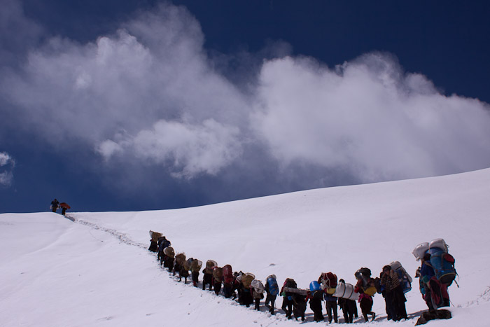 Village porters take Manaslu climbing expedition gear up to Manaslu Base Camp near Samagaon, Around Manaslu Trek, Nepal