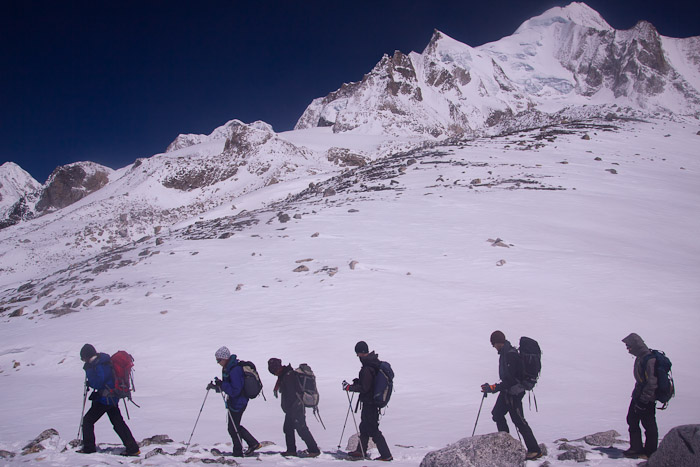 Trekking group hikes through the Larke Pass (Larkya La), Around Manaslu Trek, Nepal