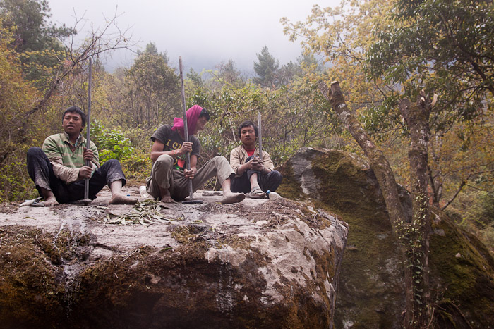 Making holes in the stone by hand to blast a new road near Dharapani, on the Around Manaslu Trek, Nepal