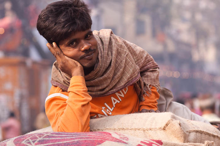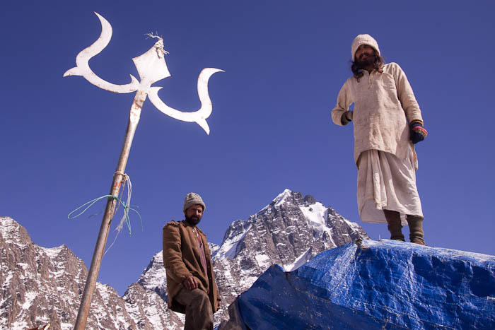 Sadhu at 4080 m (13390 ft) Manimahesh Lake, Manimahesh Kailash in the background