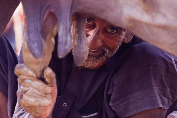 Man applies mud to the utters of a water buffalo after milking, in a village near Dhordo, Kutch, Gujarat, India