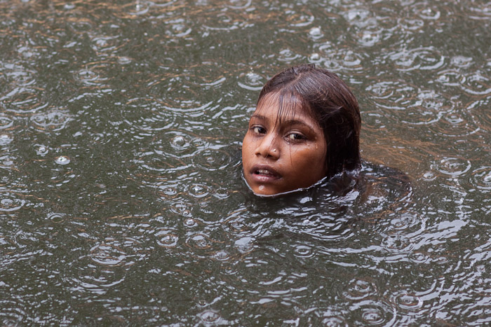 Girl takes a swim in the rain at the Kamakhya Temple tank, during the Ambabuchi Mela.