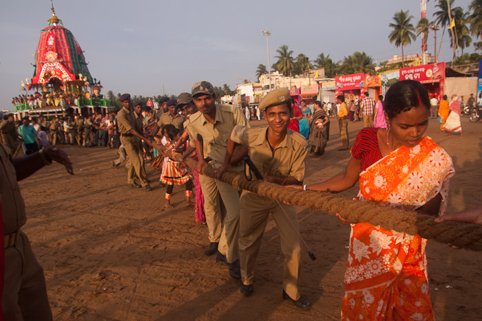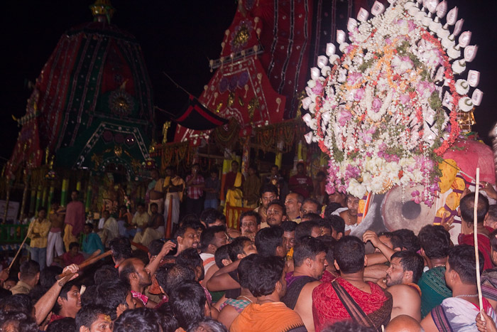 Pilgrims and police moving the temple carts to position them for the return Bahuda Yatra