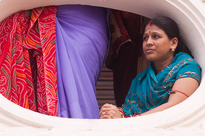 Woman watches the Bahuda Yatra (return of Lord Jagannath to his temple) from a balcony in Puri.