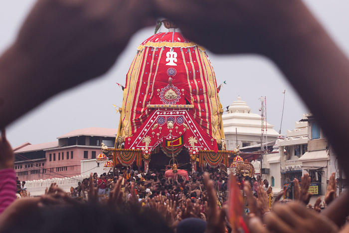 Carrying Lord Jagannath onto his Chariot for the journey to the nearby Gundicha Temple, as devotees raise their arms in jubilation, at the Ratha Yatra in Puri.