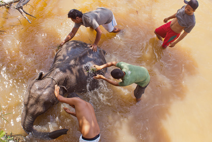 Bathing a Sumatran elephant at the elephant conservation camp, near Pekanbaru, Sumatra, Indonesia.