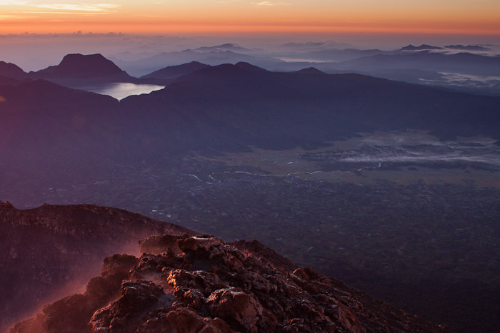 View at sunrise toward Danau Gunung Tujuh (Seven Mountain Lake) from the 3805 m (12,484 ft) summit of Mount Kerinci the highest active volcano in Southeast Asia. Sumatra, Indonesia.