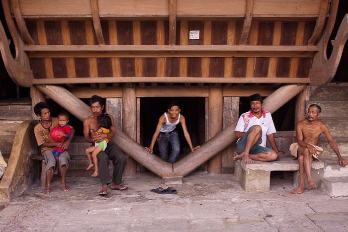 Sitting in front of a traditional house, Hilinawalo, South Nias, Inonesia