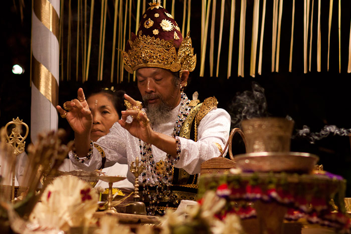 Hindu priest performs a ritual prior to the royal cremation ceremony (Pelebon) in Ubud, Bali, Indonesia