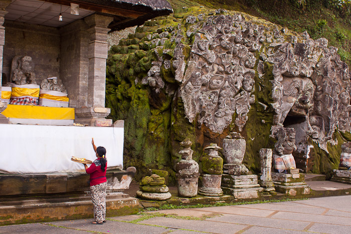 Woman presents offering at a Hindu temple, Goa Gajah, Bali, Indonesia